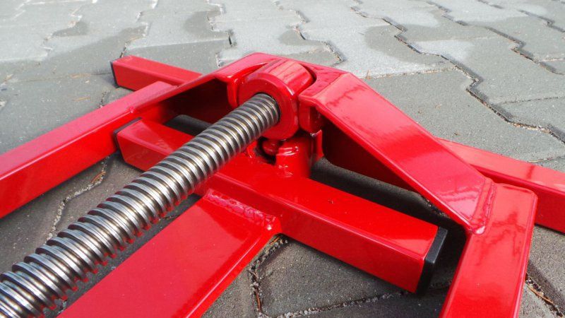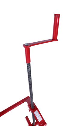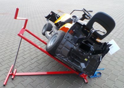 Zadními koly traktoru jednoduše najedete na rám zvedáku a otáčením závitové tyče naklopíte traktor do požadované polohy na bok v úhlu cca 40°. Spodní kolo traktoru je po celou dobu bezpečně ukotveno ke zvedáku pomocí bezpečnostního popruhu. Zatížení zvedáku až 400kg.